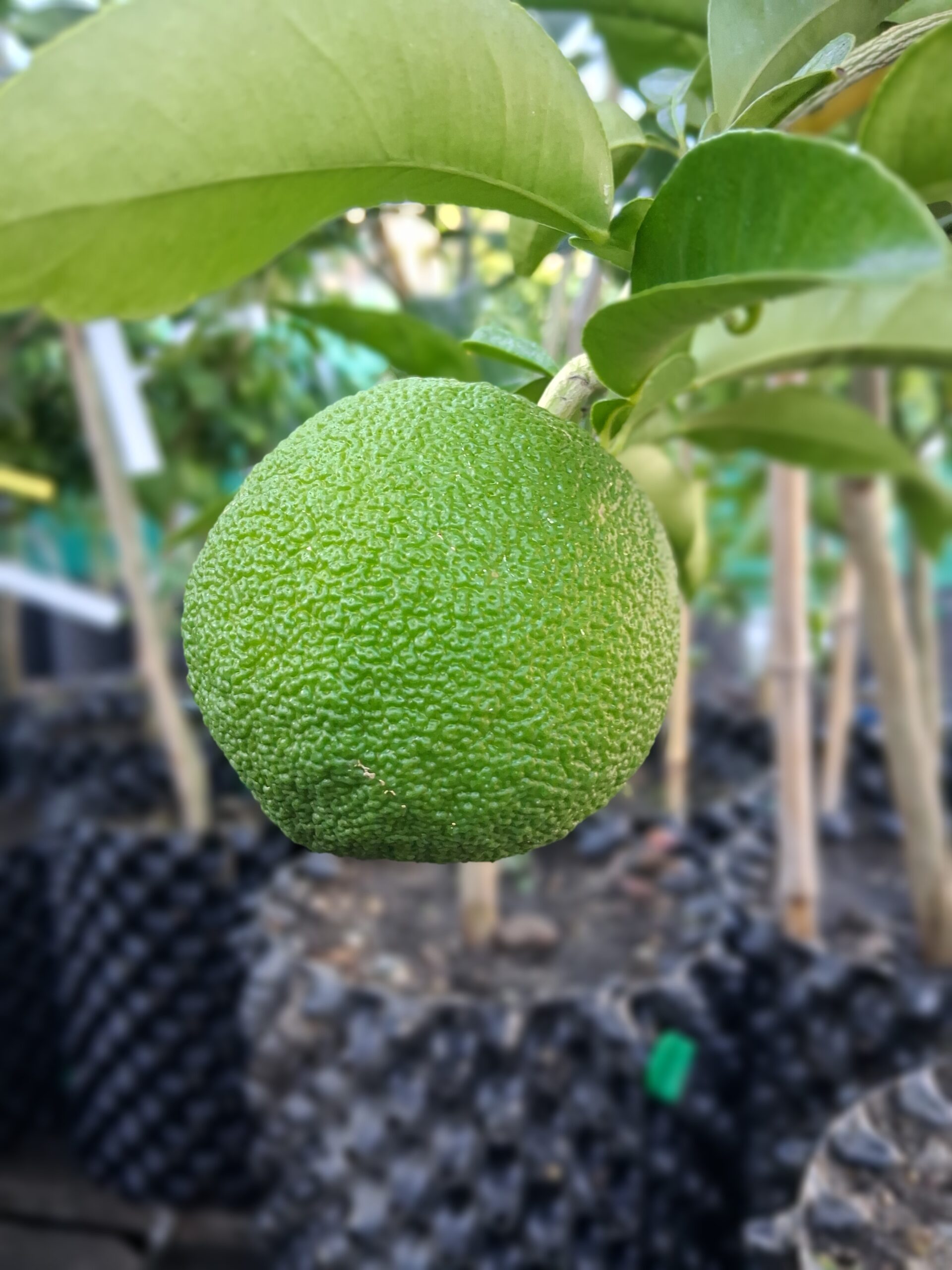 Die Frucht ist groß (300gr +) und ähnelt einer riesigen Orange mit gelbem Fruchtfleisch. Sie ist sehr saftig, sauer und aromatisch.